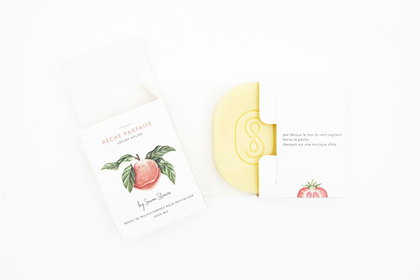 Baume solide à la pèche pour revitaliser sa peau naturellement et sans déchet.